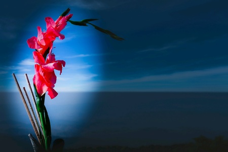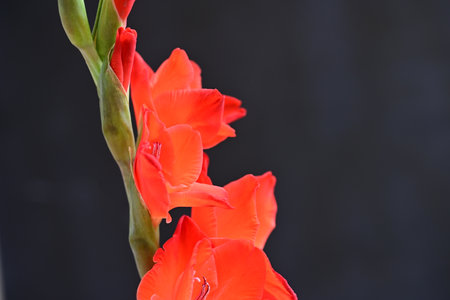 Red gladiolus. Gladiolus on gray background. Nature flower. Garden flowers. Red gladiolus flowers in summer season.