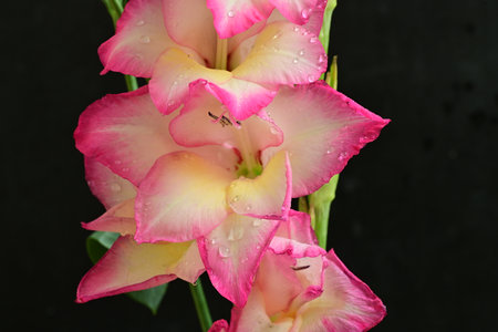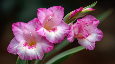 Detailed close-up image of three gladioli flowers, showcasing their vibrant pink and white petals in exquisite detail. The soft lighting and focus on the flowers' intricate texture create a captivating visual. The image is filled with delicate beauty.