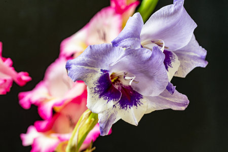 Beautiful gladiolus flower on floral exhibition. Isolated bright selection garden plant. Decorative flowers. Close up.