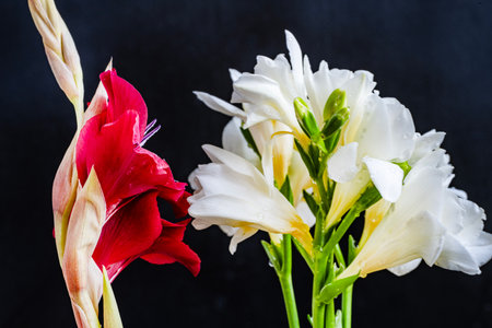 Red gladiolus. Gladiolus on black background. Nature flower. Garden flowers. Red gladiolus flowers in vase on dark background.