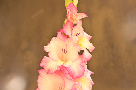 Beautiful Blooming gladiolus chocolate on a pink background. Flower head close-up.