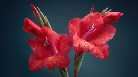 Captivating image featuring two vibrant red gladiolus flowers, showcasing intricate petal details against a dark backdrop. Ideal for floral designs and nature projects.