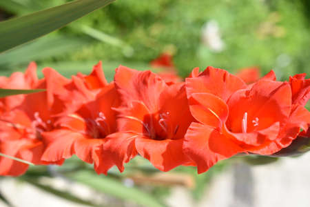 close-up of red gladiolus plant outdoor in sunny backyard shot at shallow depth of field