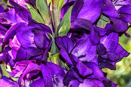 Bunch of colorful gladiolus flowers blooming in beautiful garden. Beautiful gladiolus. Gladiolus is plant of the iris family, with sword-shaped leaves and spikes of brightly colored flowers, popular in gardens and as a cut flower.
