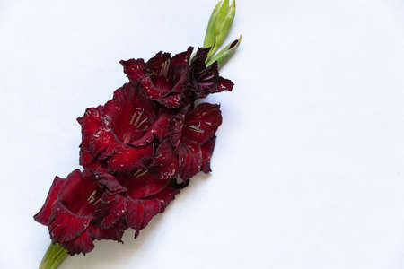 Gladiolus, sword-Lily, maroon gladiolus blooms in the garden. Close up of gladiolus flowers. Bright gladiolus flowers in summer. Large flowers and buds on a green background.