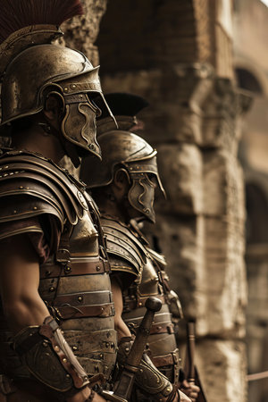 Photorealistic representation of Roman soldiers equipped with armor. Biblical figure. Historical figure.