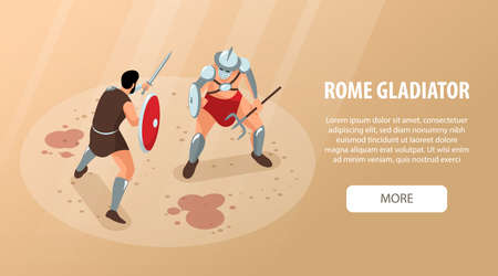 Isometric ancient rome gladiators horizontal banner with editable text more button and fighting warriors with blood vector illustration