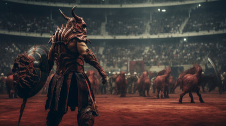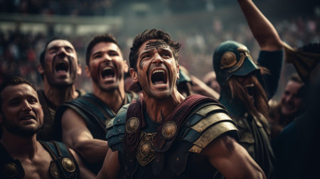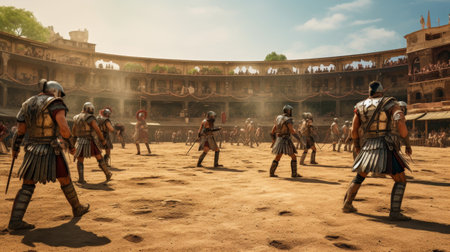 gladiators fighting in arena surrounded by cheering crowd, created with generative ai