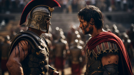 Gladiatorial combatant's heartfelt reunion with a loved one in the Roman coliseum's heart
