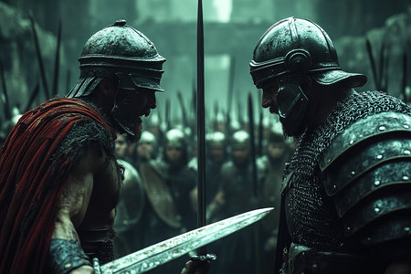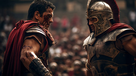 gladiator, with sword in hand, preparing to battle and his opponent, created with generative ai