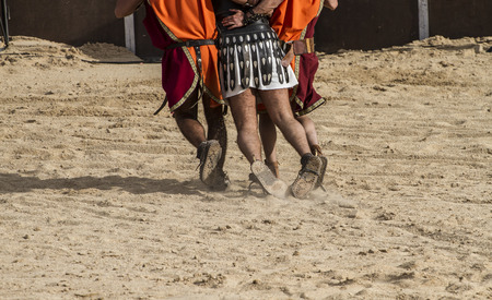 Tarragona, Spain - May 26, 2012: Gladiators on the arena of Roman Amphitheater in Tarragona, Spain. Every year, the historic recreation program TarracoViva recreates a gladiators fight