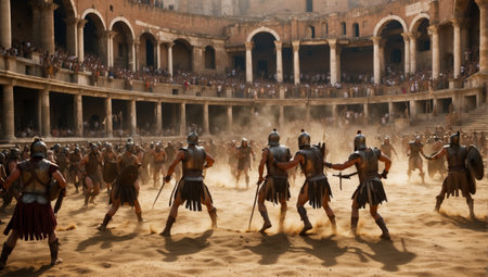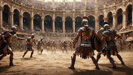 Roman gladiators fighting in a colosseum