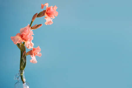 Tender soft pink color iris flower on a blue colored background. Flat lay style.
