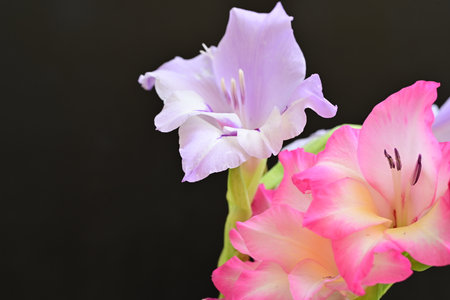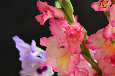 Pink gladioluses on black background. Gladiolus with copy space. Greeting card fo Valentines day, mothers day. Flat lay, top view. Frame of flowers.