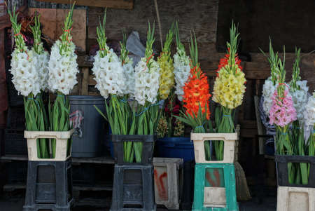 a row of long colored gladiolus flowers in bouquets in plastic buckets on an open window in the street market
