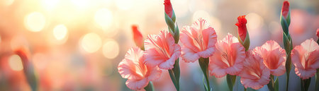 Tender pink gladiolus flowers bathed in soft sunlight, bokeh background, closeup shot, dreamy ambiance