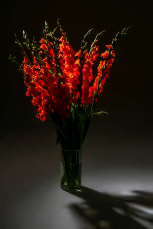 Red gladiolus. Gladiolus on black background. Nature flower. Garden flowers. Red gladiolus flowers in vase on dark background.