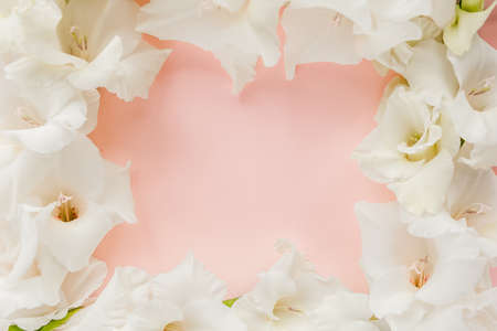Beautiful white gladioluses on pink background. Pattern of gladioli with space for your text, holiday greeting card. Valentines. Flat lay, top view.