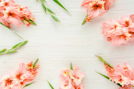 pink gladioluses on wooden white background. Floral pattern of gladioli holiday greeting card. Flat lay, top view. Frame of flowers. Flowers texture