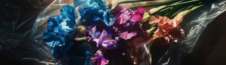 Artistic Display of Iris Flowers Wrapped in a Sheer Veil