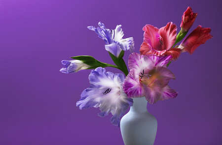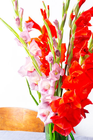 Summer bouquet of red and violet gladiolus, home decoration with flowers, bouquet with flowers on the table