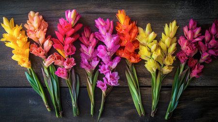 A colorful arrangement of ginger flowers placed on a wooden table, with their bright hues popping against the dark wood.