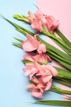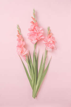 Pastel trendy bouquet of gladioli on pink background top view and flat lay