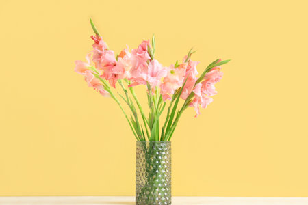 Glass vase with bouquet of beautiful gladiolus flowers on white table against yellow background