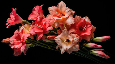 Clusters of stunning sword lilies display their vibrant pink, peach and cream petals, attracting pollinators in a peaceful garden setting during the soft light of dawn. Generative AI.