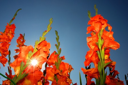 The Gladiolus in summer, Bright sunlight pierces dense foliage, the air feels hot, natural color