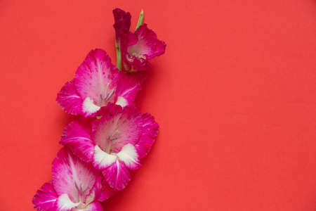 Beautiful pink Gladiolus flowers on a pink background. close-up. Place for text.