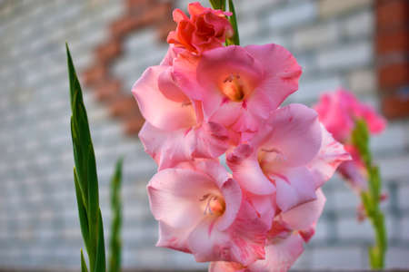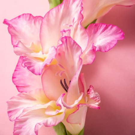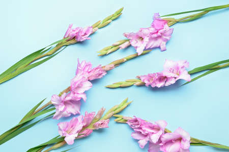 Beautiful pink gladiolus flowers on a blue background. Close-up
