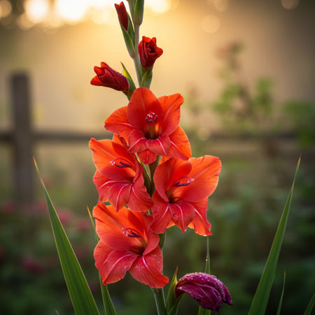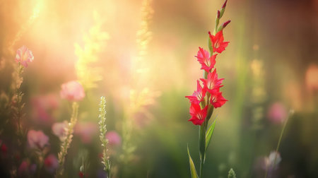 A tall stem of gladiolus displays striking red flowers, illuminated by soft natural light. Surrounding greenery and additional blooms create a serene and colorful environment.
