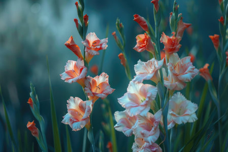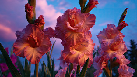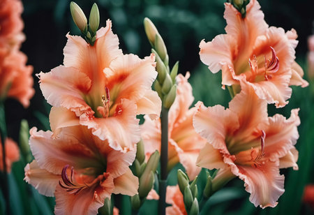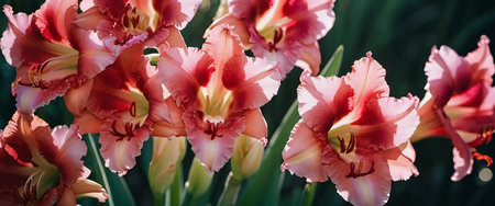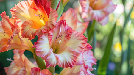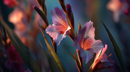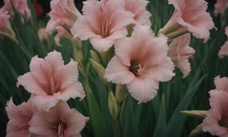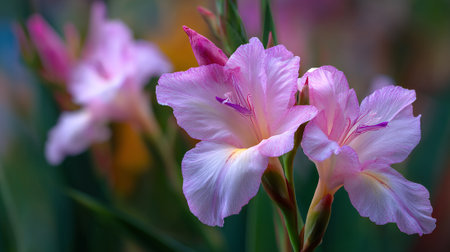 Clusters of stunning sword lilies display their vibrant pink, peach and cream petals, attracting pollinators in a peaceful garden setting during the soft light of dawn. Generative AI.