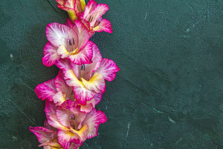 Flat lay composition with beautiful pink gladiolus flowers on concrete background