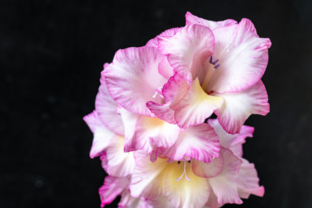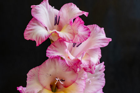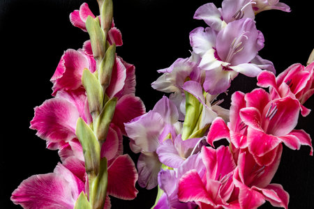 Pink gladioluses on black background. Gladiolus with copy space. Greeting card fo Valentines day, mothers day. Flat lay, top view. Frame of flowers.