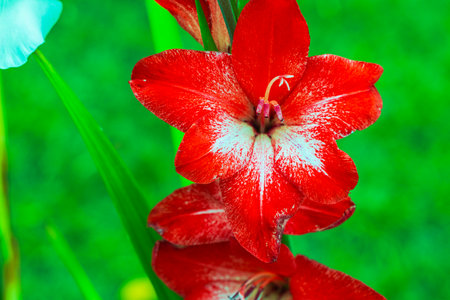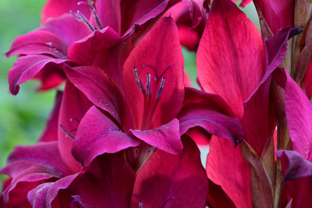 Close-up of red gladiolus flowers growing in garden with blurred green garden background.