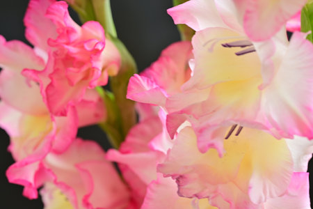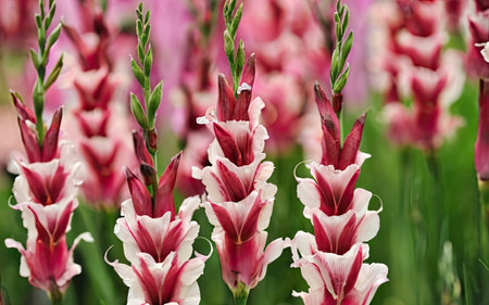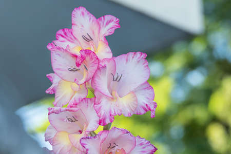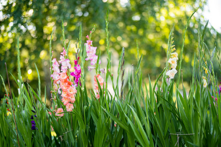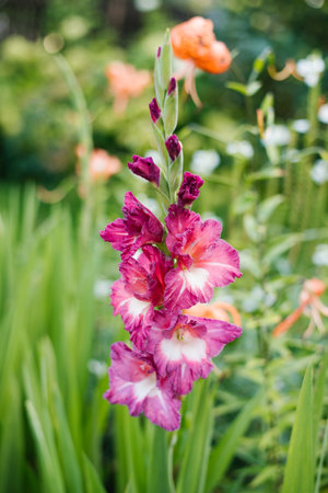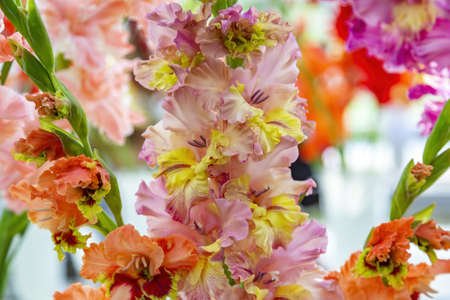 Colourful gladiolus or sword lily flowers blooming in the garden. Close-up of gladiolus flowers. Flowers blossoming in summer. Beauty in nature.