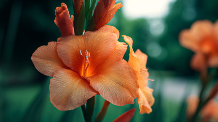 Vibrant Orange Gladiolus Blooms Graced with Dewdrops in Soft Light