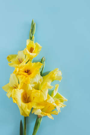 Beautiful yellow Gladiolus flowers on a blue background. Place for text.
