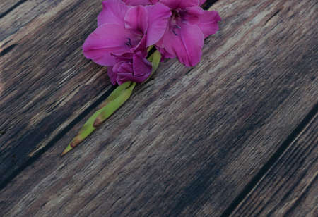 Close up of deep pink gladioli flowers and green bud against wooden background