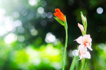 Beautiful orange gladiolus flowers in the garden on a summer day
