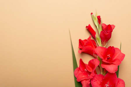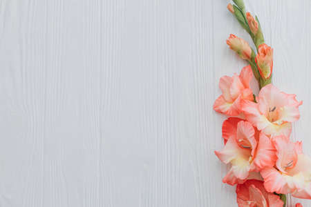 Beautiful gladiolus flowers on rustic white wood, flat lay with space for text. Floral greeting card template. Stylish red pink gladioluses. Happy Mothers day and Womens day. Hello spring