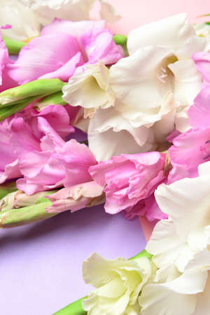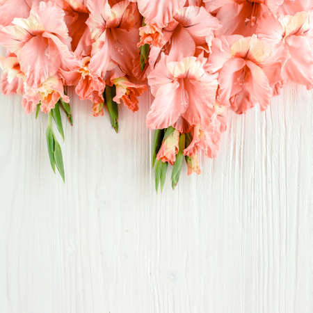 pink gladioluses on wooden white background. Floral pattern of gladioli holiday greeting card. Flat lay, top view. Frame of flowers. Flowers texture