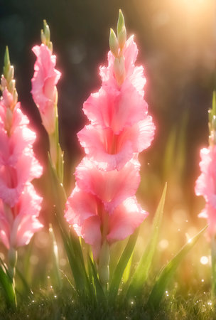 In a tranquil garden, vibrant pink gladiolus flowers stand tall, radiating beauty under the warm sunlight. Dew drops shimmer on the lush green grass, enhancing the peaceful atmosphere.