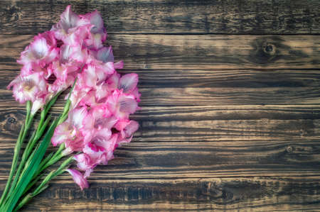 A bouquet of gladioli flowers with petals of white pink color on the background of an old wooden table close-up, top view, like a desktop wallpaper or a greeting card.