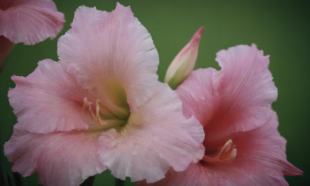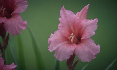 Pink gladiolus flower on green background. Close up of gladiolus flower.