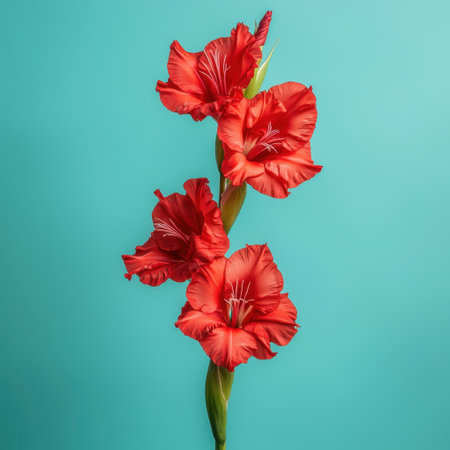 A stunning arrangement of vibrant red flowers with striking green stalks against a turquoise background, perfect for decoration or design inspiration.