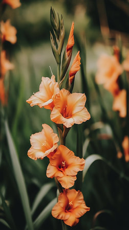 Close-up showcases a stalk of peach-orange gladiolus flowers in full bloom against a backdrop of lush green foliage, creating a beautiful botanical image.