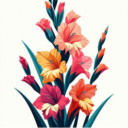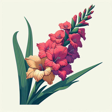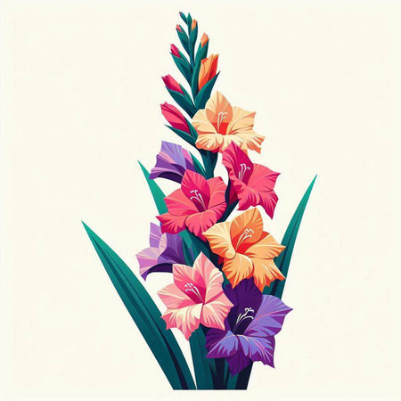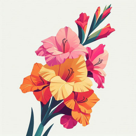 Bright colorful gladiolus flowers in retro style. Vector illustration.